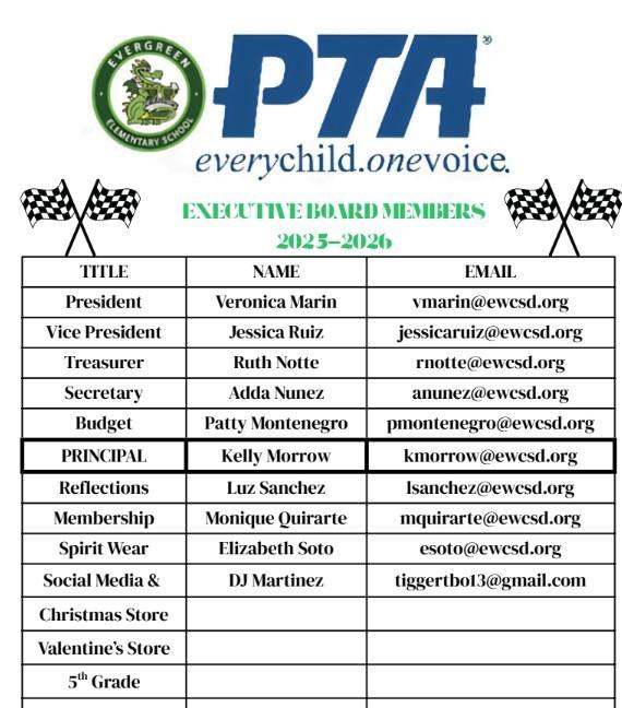 🎉 Join the Evergreen PTA for the 2025–2026 School Year! Be part of something bigger—support our students, staff, and school community by becoming a PTA member today. Your $10.00 membership helps fund events, programs, and initiatives that make Evergreen shine all year long.
